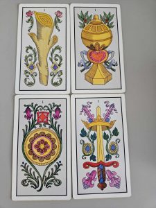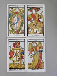 När jag lägger tarotkort så får jag oftast till mig direkt om vad som ska förmedlas. Jag har märkt med åren att ofta handlar det om personlig växt eller insikt till frågeställaren som kommer fram vid läggningarna. Förut så använde jag en och samma tarotkort till läggningarna men idag så blandar jag och använder mig utan 1 kort från 9 olika tarotkortlekar och 4 olika orakelkortlekar vid frågor och/eller läggningar. Ibland använder jag mig av pendel för att förtydliga ja eller nej svar tillsammans med kort.